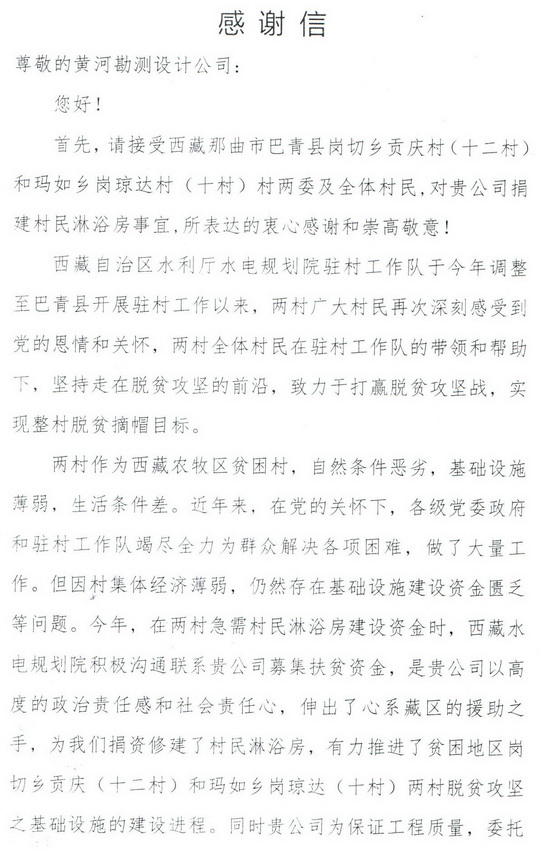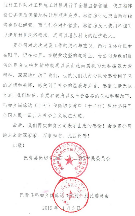 近日,公司党委收到西藏自治区那曲市巴青县岗切乡贡庆村(十二村)和玛如乡岗琼达村(十村)两村村民委员会及全体村民发来的感谢信,向公司党委捐资修建农村基础设施表达衷心的感谢和诚挚的敬意。