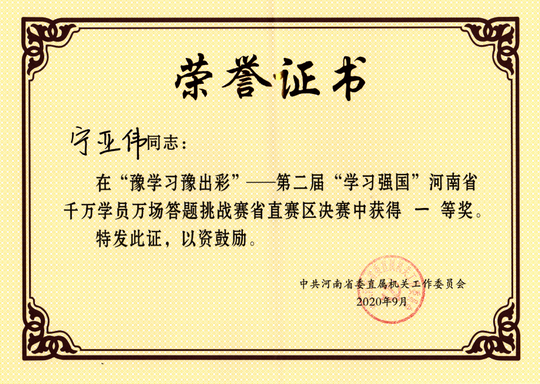 9月9日上午,省委直属机关工委举办的"豫学习豫出彩"--第二届"学习强国"河南省千万学员万场答题挑战赛省直赛区决赛举行,94名省直和中央驻豫单位"学习达人"现场展开"知识对决"。公司环境院青年党员宁亚伟代表黄委参赛,以通关成绩荣获一等奖。
