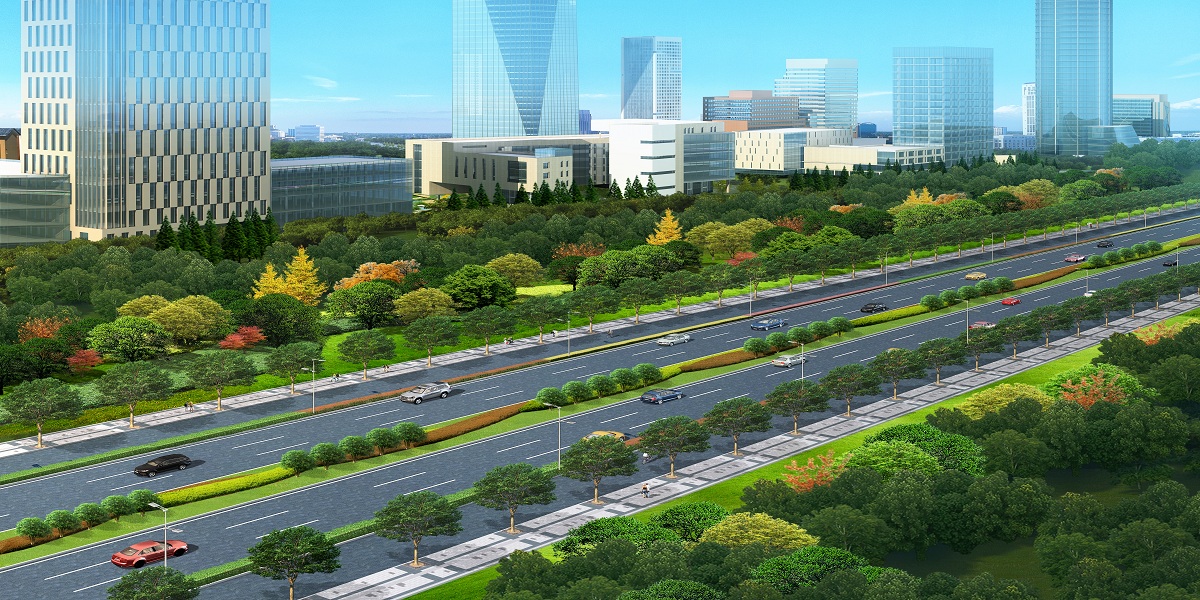郑州经开区主干道路,道路红线宽65m,全长2.7㎞,设有透水铺装、下沉式绿化带等海绵城市低影响开发设施
